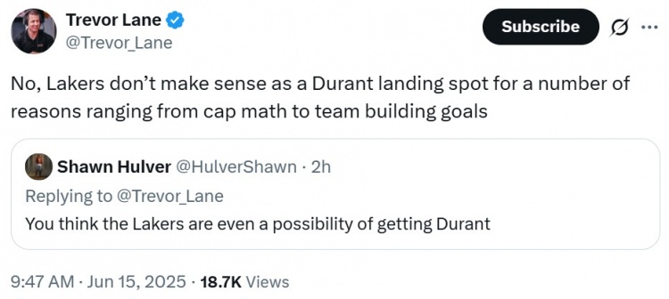 湖记:湖人不是KD的理想去处 原因包括薪资空间&球队建设目标等 更新时间:2025-06-15 13:14:35 天涯直播6月15日讯 今天,湖人队记Trevor Lane上网和网友互动。 网友:你认为湖人有可能得到杜兰特。 Trevor Lane:不,湖人并不是一个杜兰特的理想去处,原因包括薪资空间和球队建设目标等多方面因素。 【资讯关键词】:
